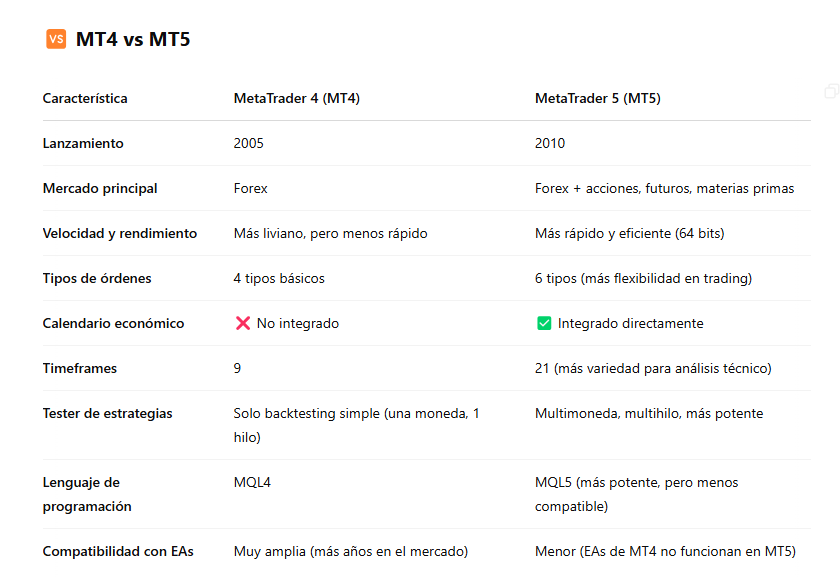 En la mayoría de los casos, MT5 es la mejor opción porque es la versión más moderna y completa. Sin embargo, muchos traders aún prefieren MT4 por costumbre o compatibilidad con sistemas antiguos.